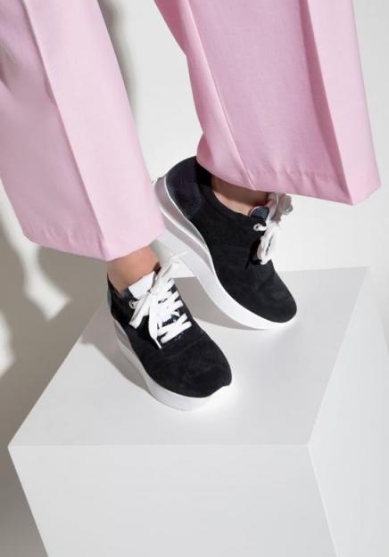 Damskie zamszowe sneakersy. Sneakersy na koturnie to stylowe połączenie stylu sportowego i elegancji. Wykonane zostały we Włoszech z wysokiej jakości skóry zamszowej. Sportowy przód urozmaicają połyskujące wstawki na języku oraz pięcie buta. Koturn w kolorowe pasy wysmukla sylwetkę i dodaje całości charakteru. Te buty są uniwersalne, a jednocześnie przykuwają wzrok. Będą świetnie wyglądały do codziennych stylizacji, ale możesz je również połączyć na przykład z ołówkową spódnicą. Damskie sneakersy zamszowe na koturnie w pasy to stylowy dodatek na każdy dzień – zarówno do pracy, jak również na spacer czy kawę z przyjaciółką.Nasza rada: przełam elegancję biurowego zestawu, wkładając do niego sneakersy na koturnie. skóra naturalna; wykonane w we Włoszech; wkładka z tworzywa sztucznego z miękką wyściółką; błyszcząca wstawka na języku oraz z tyłu buta; podeszwa na platformie z koturnem z materiału syntetycznego. skóra naturalna / materiał syntetyczny materiał syntetyczny materiał syntetyczny