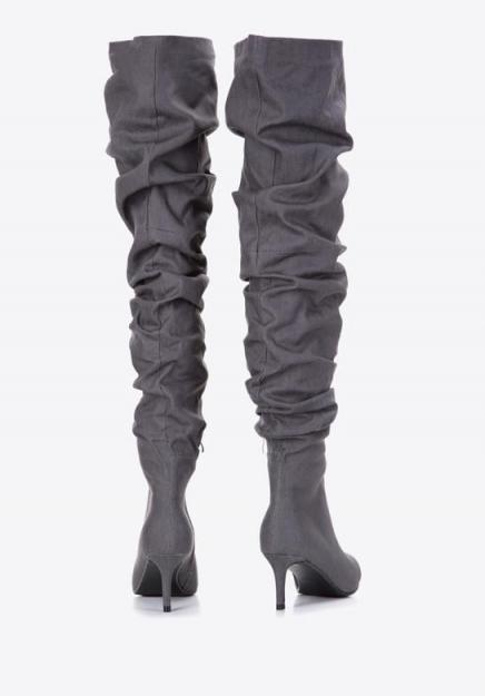Damskie kozaki na szpilce. Jeżeli śledzisz trendy modowe, to musisz wiedzieć, że damskie kozaki za kolano to najmodniejsze buty tego sezonu! Są świetnym wyborem dla kobiet, które lubią intrygować i przykuwać uwagę. Jeżeli chcesz wyróżnić się z tłumu, to nie przejdziesz obok nich obojętnie. Wyprodukowane z tkaniny bawełnianej (dżins), są niezwykle komfortowe i wygodne w noszeniu. I to pomimo 7-centymetrowego obcasa! Od zewnętrznej strony posiadają suwak, ułatwiający zakładanie butów na nogi. Co więcej, możesz je dopasować do własnych potrzeb, regulując długość i wielkość marszczeń. Damskie kozaki dżinsowe za kolano na obcasie to buty, które musisz mieć w swojej szafie. To będzie najbardziej udany zakup w tym sezonie! Nasza rada: Tak oryginalne buty nie lubią konkurencji, dlatego noś je do prostej dżinsowej mini lub klasycznej białej koszuli. materiał: 100% bawełna, wyściółka i wkładka z tworzywa sztucznego przypominającego polar, gumowa podeszwa, nosek w szpic, buty na szpilce, długa, marszczona cholewka – długość do połowy uda, po wewnętrznej stronie suwak, ułatwiający zakładanie butów na nogi. materiał włókienniczy materiał włókienniczy materiał syntetyczny