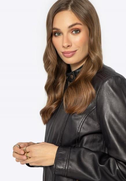 Damska kurtka ze skóry z przeszyciami Ta klasyczna kurtka ze skóry to must have każdej kobiety, która ceni sobie wygodę i ponadczasowy styl. Wykonana z wysokiej jakości, miękkiej i delikatnej owczej skóry, gwarantuje długotrwałe użytkowanie. Skórzana kurtka nigdy nie wyjdzie z mody, dzięki jej właściwości szlachetnego starzenia się. Z biegiem lat nabierze pożądanego przez wielu wykończenia vintage. Ten luksusowy materiał cechują właściwości oddychające, dzięki czemu kurtka jest komfortowa w użytkowaniu. Krótszy fason kurtki doda Ci swobody, zaś taliowanie podkreśli Twoje kobiece walory. Zapinana jest na prosty zamek w kolorze mosiądzu, który pięknie współgra z kolorem kurtki. Ten model posiada na froncie dwie kieszenie na suwak, w których zmieścisz najpotrzebniejsze drobiazgi. Dzięki stójce zapinanej na napę pięknie podkreślisz swoją szyję, a przeszycia na ramionach ożywią najprostszą stylizację. Dla kogo Ta niekwestionowana ikona stylu jest idealna dla kobiet, które cenią klasykę w nowoczesnym wydaniu. Nasza rada: Używaj produktów do pielęgnacji konkretnego rodzaju skóry, np. past czy sprayów, tak aby jak najdłużej zachować pierwotny wygląd kurtki. Kluczowe cechy: Materiał zewnętrzny: Kurtka wykonana jest z niezwykle pożądanej ze względu na swoją trwałość – owczej skóry. Sezonowość: Kurtka sprawdzi się w sezonie wiosennym, letnim i jesiennym. Pięknie współgra z trampkami w letnie wieczory, wiosennymi sukienkami i jesiennymi botkami. Estetyka: Prosty suwak w kolorze mosiądzu sprawia, że kurtka nabiera wyglądu vintage. Praktyczność: Dwie kieszenie zamykane na suwak to bezpieczeństwo dla Twoich rzeczy. Skład: Materiał zewnętrzny: 100% skóra naturalna owcza; podszewka: 100% poliester. Kurtka damska ze skóry to inwestycja na lata. Nie czekaj dłużej i zaopatrz swoją garderobę w ten model!