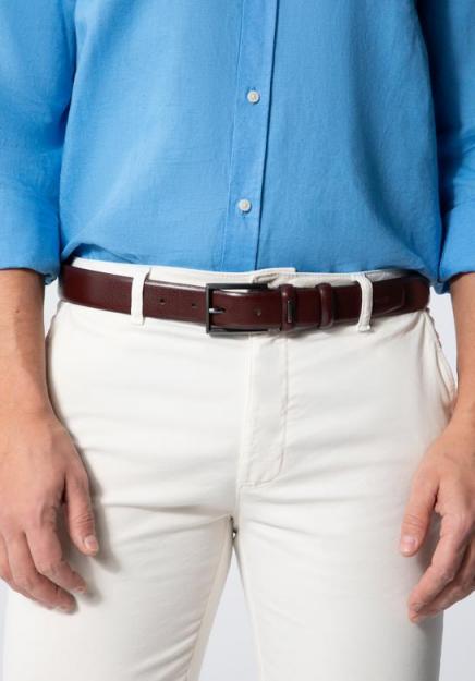 Męski pasek skórzany. Ten elegancki pasek spodoba się miłośnikom klasyki. Wykonany został z wysokiej jakości skóry naturalnej. Elegancka, geometryczna klamra w kolorze grafitowym dodaje mu szyku. Gładki model bez zdobień będzie idealnym dopełnieniem zarówno półformalnych, jak i codziennych stylizacji. Męski pasek skórzany z geometryczną klamrą to stylowy dodatek, który możesz nosić przez wiele sezonów.Nasza rada: to świetny pasek na co dzień.Ten model ma możliwość skrócenia. W tym celu trzeba wyjąć pasek z klamry, odkręcić nit, i uciąć pasek do pożądanej długości. Dzięki temu nie ma konieczności wymiany pasków, jeśli zdarzy Ci się schudnąć. 100% skóra naturalna; klasyczna klamra; zapakowany w aksamitny woreczek.