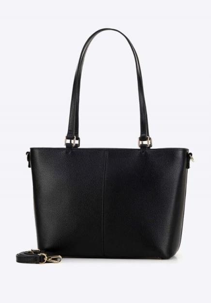 Skórzana shopperka z czterema stabilnymi nóżkami Wprowadź do swojej garderoby elegancję i funkcjonalność dzięki torebce shopperce wykonanej ze skóry naturalnej. To wyjątkowe połączenie klasycznego stylu i praktyczności, które spełni oczekiwania nowoczesnej kobiety. Subtelne detale, takie jak logo producenta umieszczone z przodu, dodają jej elegancji, sprawiając, że stanie się idealnym akcentem w każdej stylizacji. Dla kogo Torebka to doskonały wybór dla aktywnych kobiet, które potrzebują praktycznego rozwiązania na co dzień – zarówno do pracy, jak i na zakupy czy spotkania ze znajomymi. Nasza rada: Torebkę możesz z łatwością łączyć zarówno z casualowymi zestawami, takimi jak jeansy i T-shirt, jak i eleganckimi stylizacjami, na przykład sukienką czy spódnicą midi. W codziennych look’ach świetnie sprawdzą się sneakersy lub baleriny, natomiast do bardziej formalnych outfitów wybierz szpilki lub botki na obcasie. Kluczowe cechy: Materiał: Wykonana z trwałej i eleganckiej skóry naturalnej, co gwarantuje wyjątkowy wygląd. Funkcjonalne przegródki: Wyposażona w jedną kieszeń na zamek oraz dwie otwarte kieszonki, torebka umożliwia łatwe przechowywanie i organizację niezbędnych drobiazgów. Detale: Subtelne logo producenta z przodu podkreśla luksusowy charakter torebki. Cztery nóżki: Torebka posiada 4 nóżki na spodzie, które nie tylko dodają elegancji, ale przede wszystkim chronią dno torebki przed zarysowaniami i zabrudzeniami. Skład: 100% skóra naturalna; podszewka: 100% poliester. Wygodne i funkcjonalne rozwiązania: Komfort noszenia: Dwie wygodne rączki oraz odpinany, regulowany pasek pozwalają nosić torebkę na różne sposoby – w ręku lub na ramieniu. Dodatkowe kieszenie: Dwie kieszenie na froncie – jedna zamykana na zamek, a druga na magnes, umożliwiają szybki dostęp do najczęściej używanych rzeczy. To idealny dodatek, który podkreśli Twój styl i zaspokoi Twoje codzienne potrzeby. Zamów już dziś i odkryj, jak łatwo możesz połączyć modę z funkcjonalnością!