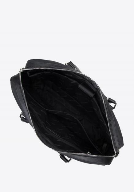 Męska torba na laptopa. Z tą torbą na laptopa możesz chodzić do pracy, jak i po pracy. Wykonana została z wysokiej jakości poliestru o lekkim połysku. Pionowa tasiemka zdobiąca przód torby, nadaje jej sportowego charakteru. Wewnątrz zmieścisz dokumenty w formacie A4, portfel, telefon, kalendarz i kilka drobiazgów. W miękko wyściełanej kieszeni schowasz urządzenie elektroniczne o maksymalnych wymiarach: 28 cm x 36 cm. Męska torba na laptopa 17” z tasiemką to świetny wybór dla każdego stylowego mężczyzny.Nasza rada: możesz nosić ją w ręku lub na doczepianym pasku.Wewnątrz: pomieści format A4; miękko wyściełana kieszeń na urządzenie elektroniczne o maksymalnych wymiarach: 28 cm x 36 cm; ciemna podszewka w logo WITTCHEN; trzy kieszenie, w tym jedna na suwak. Dodatkowo: poliester; dopinany, regulowany pasek z tkaniny; kieszeń od strony ciała zamykana na suwak; zamykana na suwak.
